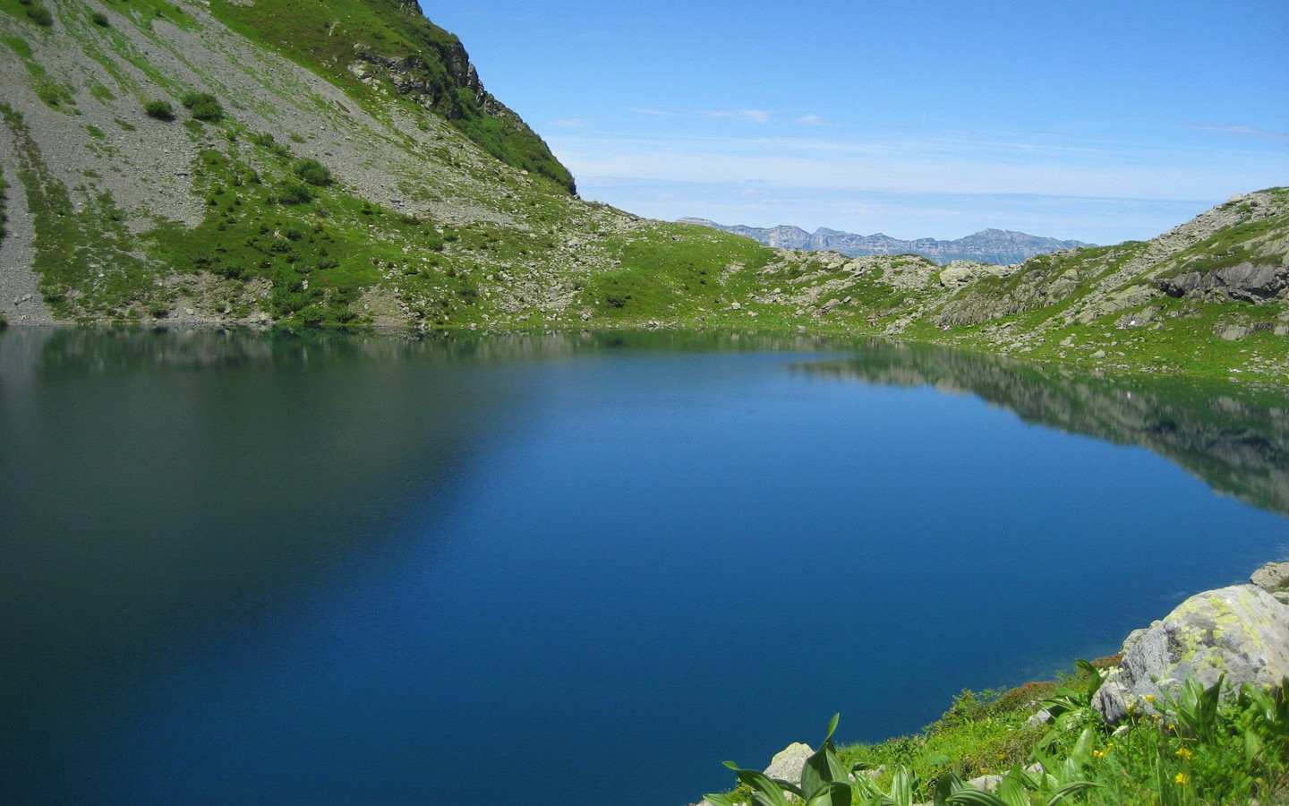 视线掠过如镜的湖面,便会被岸上那片蓬勃的秋色所吸引。树木并未显露出萧瑟,反而披上了由橙黄、锈红与残绿交织的厚重锦袍。它们一丛丛、一簇簇地生长在灰褐色的岩坡上,岩缝间点缀着枯黄的秋草,于苍劲中增添了生命的暖意。这丰富的色彩层次,正是秋季最令人着迷的特质——它并非单一的金黄,而是从深邃的绿过渡到灿烂的金,再燃烧成热烈的红,如同经过精心设计的分区壁纸,每一片色彩都安放在最恰当的位置,共同构成和谐而极具视觉冲击力的整体。