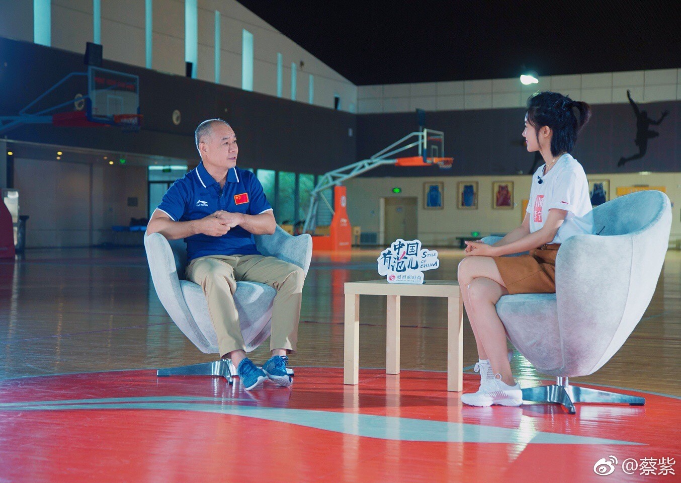 蔡紫与工作人员交流互动,姿态放松,眼神中流露出真诚与亲和力